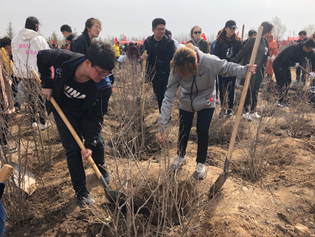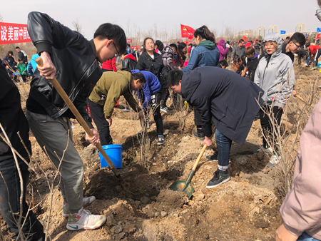 上午九点三十分,在进行简单的任务分配后,青协负责人组织志愿者从挖树坑开始植树活动。参与活动的志愿者克服风沙很大,道路泥泞的重重困难,积极参与,干得热火朝天,不管男生还是女生,他们都很认真的对待这次活动。尽管冬日的冻土还没有完全融化,地质还有一点硬,树坑很难挖,志愿者们没有一句抱怨,相反却互相鼓励,彼此协作,共克难关。因为他们知道,他们不仅仅是在为城市建设增添绿意,更是在用自己的实际行动践行劳动精神,践行建设美丽家园、美丽中国,切切实实地做着贡献。每每起身,抹去汗水的时候,他们放眼望去,仿佛看到了一片片新绿,正在为我们这座多风沙的城市阻拦沙尘;仿佛看到了一片片新绿,正作为城市的“肺”,为城市换气,构筑出一幅人与自然和谐相处的美丽画卷。