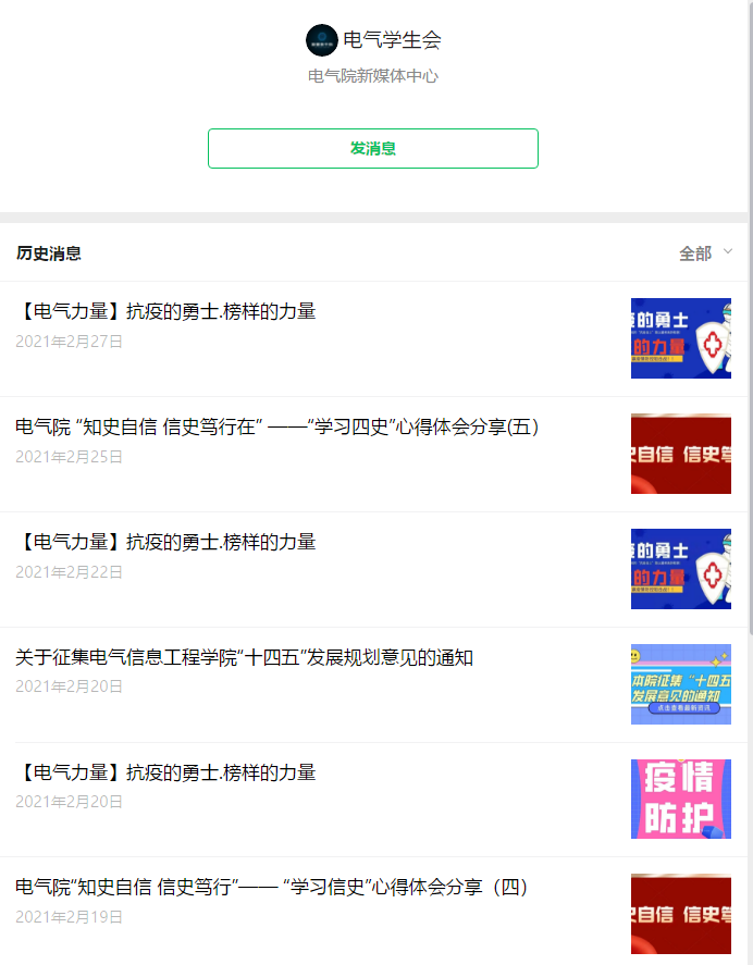 在“电气学生会”微信公众号推出主题《【电气力量】抗疫的勇士.榜样的力量》。寒假以来,我院学子纷纷在家乡加入了抗击疫情志愿者的团队,截止1月30日,已有51名同学工作在志愿者的岗位上,中高风险地区河北省承德市、绥化市、牡丹江、黑河均有电气学子的支援力量。通过《抗疫的勇士.榜样的力量》将这些优秀志愿者的工作记录下来,大学生志愿者们坚守在防疫最前沿,虽从点滴小事做起,却用实际行动诠释了“奉献、友爱、互助、进步”的志愿精神,为抗击疫情贡献着青春力量,切身体会着自身肩负的责任与使命。