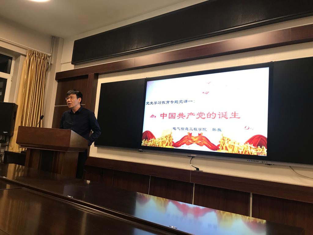 4月7日,学院党委副书记韩巍在所联系大学生第一党支部,做了一次主题为《中国共产党的诞生》的专题党课,开启了电气院学生党员党史学习教育的第一课。他从1919年五四运动,中国青年群体中马克思主义的传播为中国共产党的成立奠定了思想条件讲起,接下来从组织条件、干部条件等各方面以及中共一大的会议过程,向学生党员详细讲解了建党的历程,进一步阐明了中国共产党初期的纲领、任务以及党的初心、使命。并且,他向学生党员们再次强调了习近平总书记对党史学习的重大意义的重要讲话精神:历史是最好的教科书,中国革命历史是最好的营养剂。学习党史、国史,是坚持和发展中国特色社会主义、把党和国家各项事业继续推向前进的必修课。在对历史的深入思考中做好现实工作,更好走向未来,不断交出坚持和发展中国特色社会主义的合格答卷。