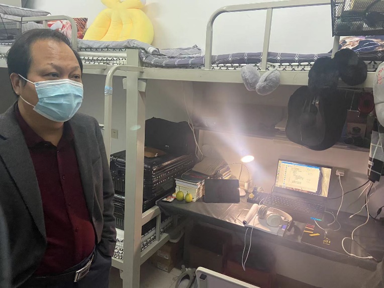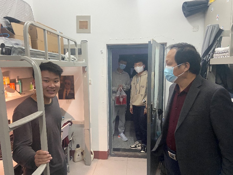 2022年4月5日晚,2007so太阳集团院长邵克勇、党委副书记韩巍,兼职辅导员曹洋,作为住校学院负责人,到本科生宿舍走访学生,调研封闭管理学生实际学习情况和帮助解决生活困难。