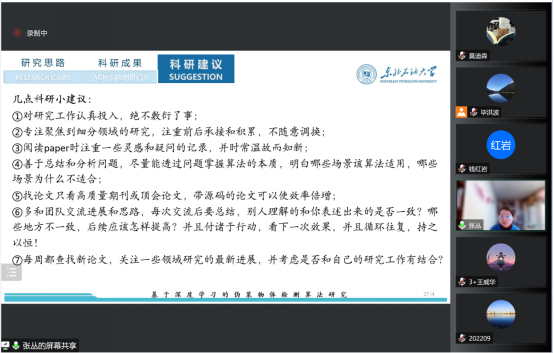 分享会上,张丛讲述了她在研究生阶段的科研学术经验,并结合现阶段课题的研究进展,阐述当前研究课题背景意义、研究重难点、解决措施、研究的思路及实现细节,为研究生同学讲述如何进行前期课题调研,中期创新点寻找,后期理论实践结合等环节。她还结合个人研究生期间的经历,为研究生同学们提出几点科研建议。