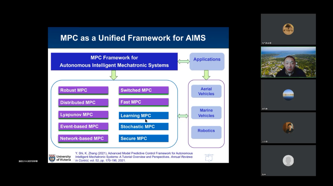 本次专题讲座,施阳教授首先介绍了自主智能系统的基本概念,阐述了在工业4.0时代自主智能系统的应用前景,并介绍了现今社会已经熟练使用自主智能系统的各种案例,然后以自主智能系统引出模型预测控制的基本概念,并分别介绍了模型预测控制的两种设计框架,以及模型预测控制算法在各种自主智能系统中的应用。