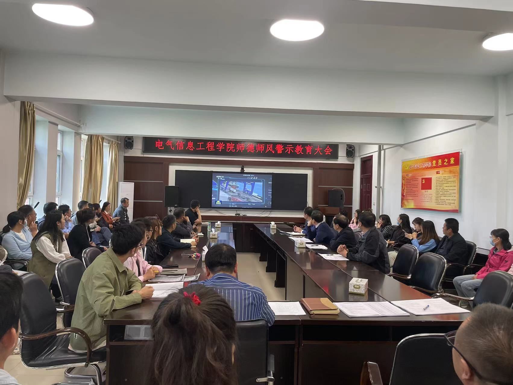 2007so太阳集团于2024年5月24日14:00在电气院317会议室召开师德师风警示教育大会。包括师德师风专项整治工作小组成员共78人参加。会上院长邵克勇向全体教师传达学校会议精神和工作安排。并由年轻教师张志强等人领学《新时代高校教师职业行为十项准则》和《师德师风警示教育学习汇编》。