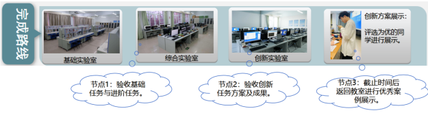 线下要求学生通过运用计数器原理设计一个“停车场系统”,要求利用TRIZ理论工具,如矛盾分析、物-场模型分析等工具进行分析,并在开放创新实验室中完成项目的搭建及测试。 实验案例紧扣“两性一度”,实验内容设置是知识、能力、素质的有机融合,着重培养学生解决复杂问题的综合能力。并反映了前沿性和时代性,教学形式呈现先进性和互动性,学习过程具有探究性和创新性。实验课程有一定难度,需要跳一跳才能达到,对学生操作有较高挑战度。 学生进入实验室,进行基础任务,进阶任务,创新任务的搭建,并且彼此对创新电路的设计思路,运用的创新工具等进行展示。
