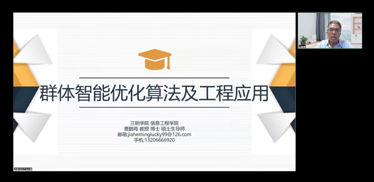 2023年10月20日,三明学院电子信息学科带头人贾鹤鸣博士应我院邀请,通过腾讯会议平台在线上为我院师生做《群体智能优化算法及工程应用》为主题的专题讲座暨2007so太阳集团学术月第八讲。讲座由2007so太阳集团科研院长徐建军主持,我校师生共计50余人参会交流、研讨。