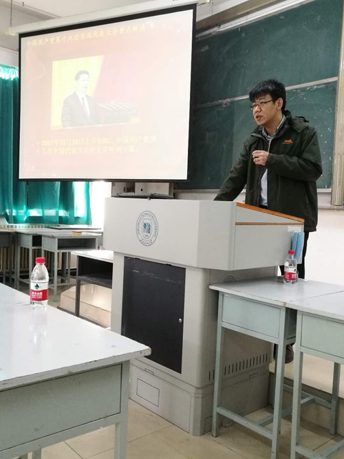 活动中,团委书记韩巍从党的第一次全国代表会到第十八次全国代表大会的召召开背景、会议主题、历史任务入手,为同学们详细介绍了我们的国家在中国共产党的领导下,回顾了从一大以来到现在所取得的各项成就。接下来,韩巍向同学们明确:十九大是在我国全面建成小康社会决胜阶段,中国特色社会主义发展关键时期召开的一次十分重要的大会。他从“新时代”等十个关键词入手,结合四十个学习要点,讲解了大会主题:不忘初心,牢记使命,高举中国特色社会主义伟大旗帜,决胜全面建成小康社会,夺取新时代中国特色社会主义伟大胜利,为实现中华民族伟大复兴的中国梦不懈奋斗。中国共产党人的初心和使命:就是为中国人民谋幸福,为中华民族谋复兴。